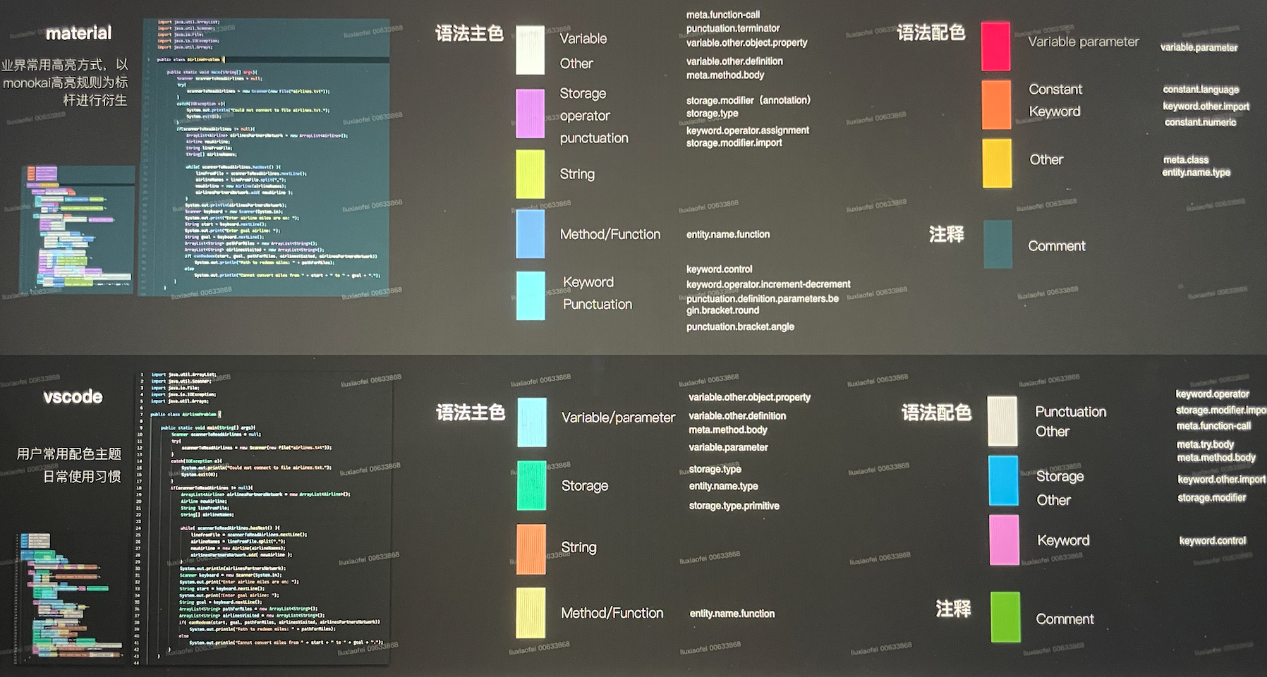 According to the developers, we summarize the relationship between the colours and semantic scope tokens, then compared our findings with the most popular themes(vscode, material) which match the spectrum.